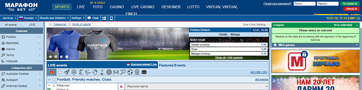 Payment Methods: MarathonBet accepts Credit cards, Webmoney, Neteller, EcoPayz, Qiwi, Moneta, Yandex and all the methods displayed below for use with your Ruble betting account. Note that although you may deposit with bitcoin, you will still bet using a national currency as selected when you register your account. You will then get the exchanged value of your bitcoin in your account currency upon btc deposit.